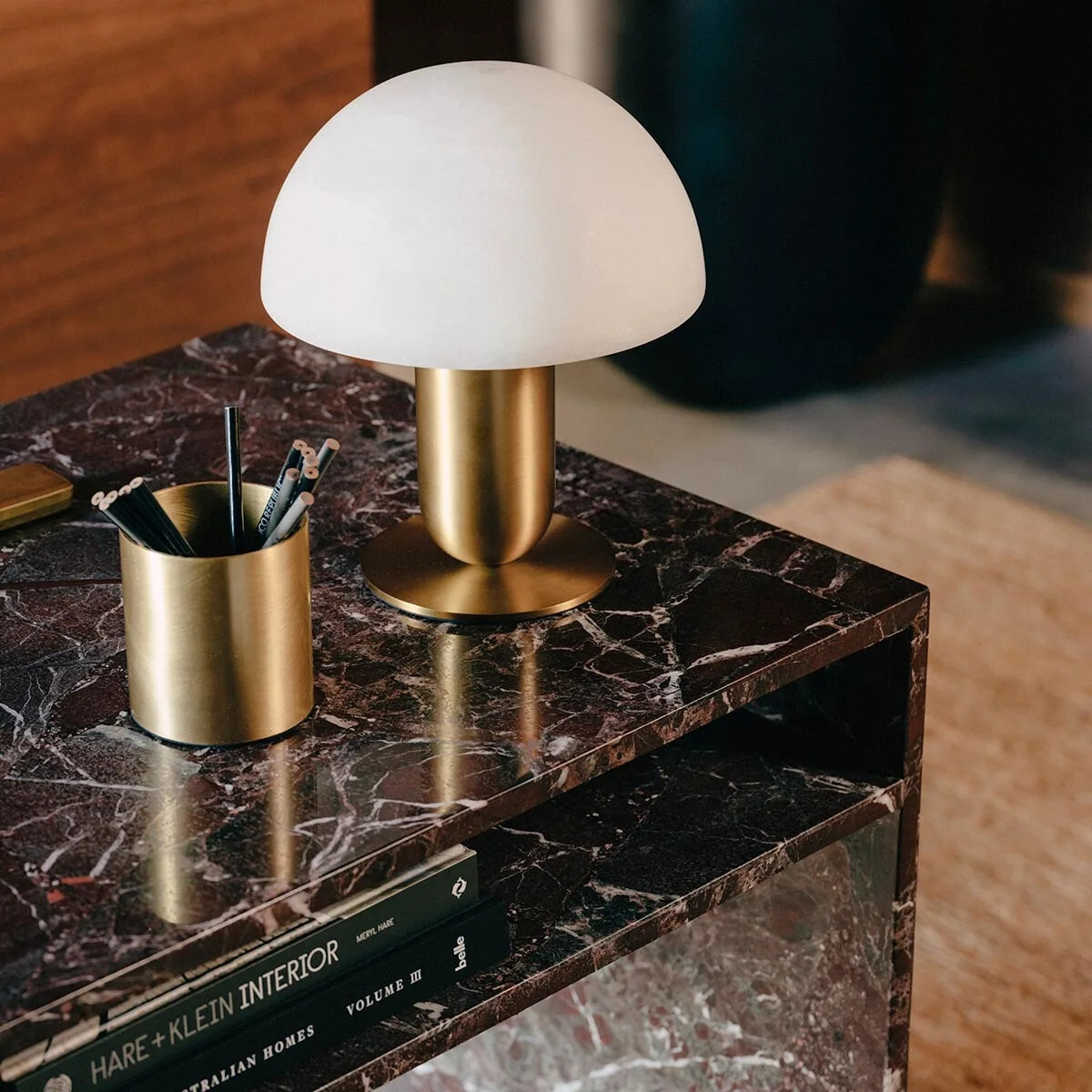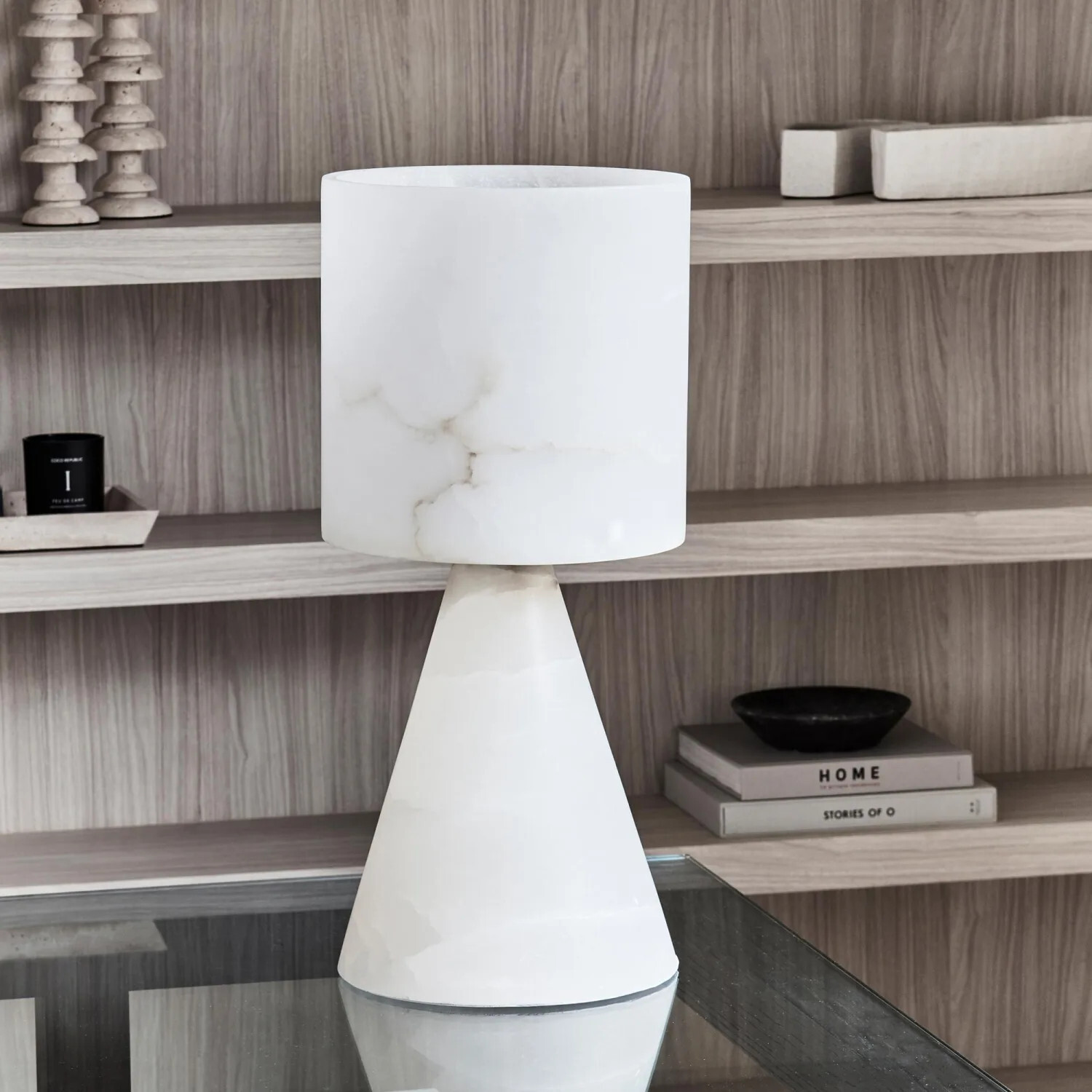 Table lamps like the Odeon Table Standing Lamp or the Otis Alabaster Table Lamp play a crucial role here. Positioned on consoles, shelving or dining sideboards, they provide soft pools of light that support conversation.