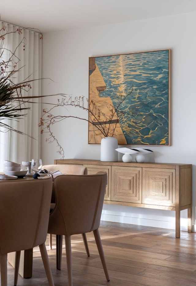In the living room, our design team found the perfect balance between comfort and elegance. The Malone Modular Sofa in a neutral shade forms a relaxed yet refined base, its generous scale and adaptable design ideal for contemporary family life. Paired with the sculptural Bodega Occasional Chair and the understated Oslo Coffee Table, the space strikes just the right note between cutting-edge design and liveable ease. Layered, geometric textiles and graphic art inject vibrancy, while maintaining a calm, cohesive palette.